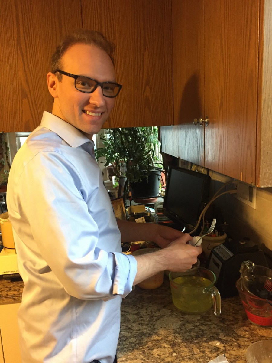 Galen, the day before our wedding, separating eggs for the ten cheesecakes we baked!